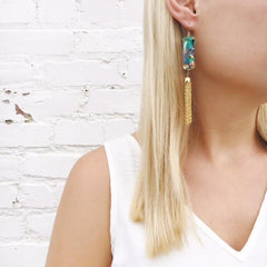 When the resin is ready it’s hardened and no longer sticky to the touch. I then pop out the pieces to inspect and cut away any extra resin or papery bits from around the edge or the back that are sharp. At this point I paint each piece with a clear, water-based sealer to make the surface shine...this makes the color pop and the acrylic appear crystal-clear. Once the coating is completely dry I affix the paillettes and ear findings with a strong adhesive and then assemble any styles that are more than one piece of resin.